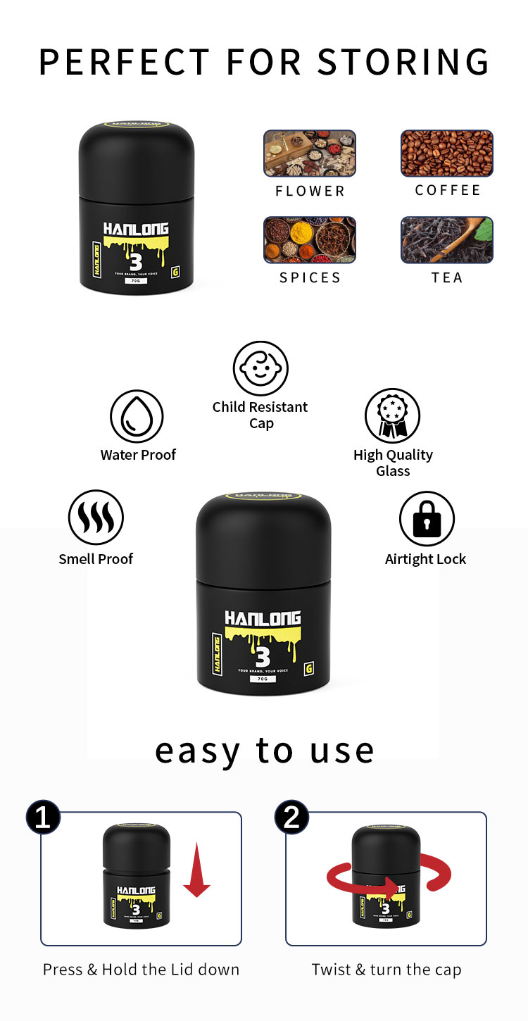 5ml 50ml 70ml 110ml Empty Smell Proof Jar Container Child Resistant Lid Packaging Custom Printing Black Frosted Glass Jar