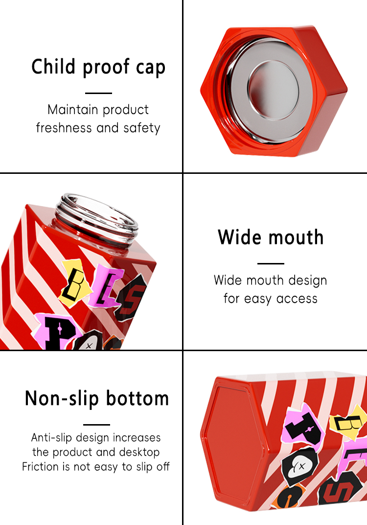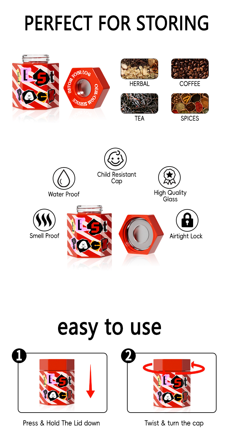 Vacuum sealing: The unique vacuum sealing design is used to extract the excess air from the tank through the bending of the metal cover, forming a gas tight environment, preventing oxidation, significantly extending the shelf life of the stored items, maintaining their freshness and effectiveness, especially suitable for herb concentrates such as hemp flowers that are sensitive to environmental factors. High quality material: The bottle body is made of durable food grade glass, and the bottle cap is equipped with a stainless steel vacuum disc and food grade sealing gasket to ensure sealing and safety. It is reusable, environmentally friendly, and durable. Child safety design: Some styles of pop/vac jars have a child safety lock function, which requires pressing and rotating the lid to open, increasing the safety of use and preventing children from accidentally touching. Easy to use: When the lid is screwed on, hearing a "click" sound indicates that it is in a perfect vacuum sealed state; When unscrewing the lid counterclockwise, a "bang" sound will be heard, indicating that the vacuum seal has been released, and the vacuum disc can be seen through the lid to confirm whether the vacuum state has been reached or released.