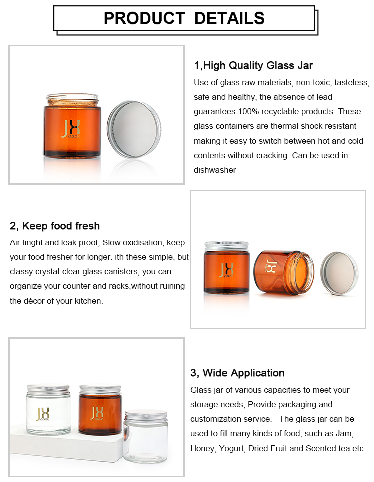 Luxury clear amber brown glass jar cookie tea packaging food grade jar with aluminum lids containers