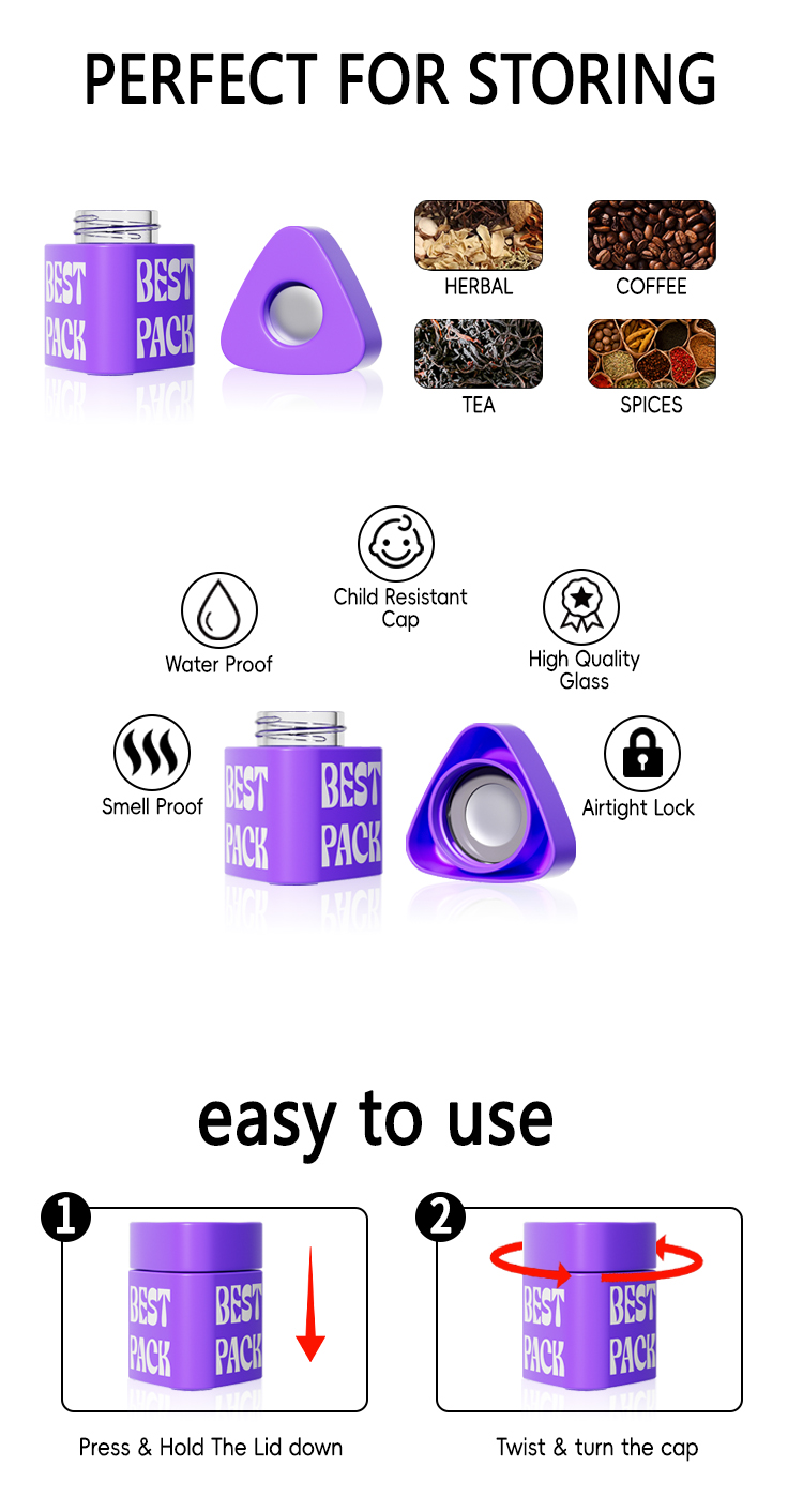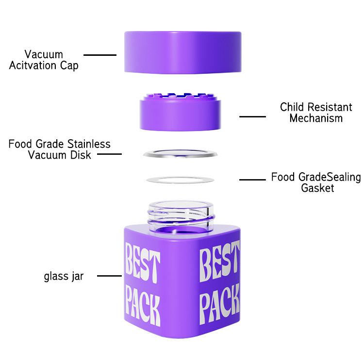 Vacuum sealing: The unique vacuum sealing design is used to extract the excess air from the tank through the bending of the metal cover, forming a gas tight environment, preventing oxidation, significantly extending the shelf life of the stored items, maintaining their freshness and effectiveness, especially suitable for herb concentrates such as hemp flowers that are sensitive to environmental factors. High quality material: The bottle body is made of durable food grade glass, and the bottle cap is equipped with a stainless steel vacuum disc and food grade sealing gasket to ensure sealing and safety. It is reusable, environmentally friendly, and durable. Child safety design: Some styles of pop/vac jars have a child safety lock function, which requires pressing and rotating the lid to open, increasing the safety of use and preventing children from accidentally touching. Easy to use: When the lid is screwed on, hearing a "click" sound indicates that it is in a perfect vacuum sealed state; When unscrewing the lid counterclockwise, a "bang" sound will be heard, indicating that the vacuum seal has been released, and the vacuum disc can be seen through the lid to confirm whether the vacuum state has been reached or released.